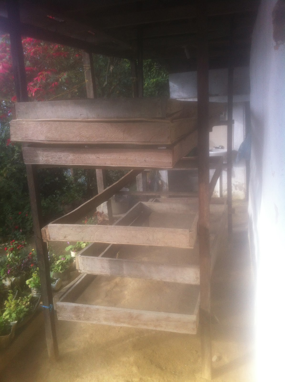 After pulping and demucilating the coffee goes into soaking tank overnight. Early in the morning they take it to skin drying tables, which are always totally shaded. If it's taken direct to sun the parchment will crack and the coffee dry too quickly. On skin drying tables they are also sorting out any visible defects. Here the coffee is 3-4 hours, then moved to regular drying tables, where they keep sorting.